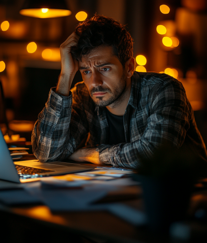 A focused shell designer sitting at his desk with a focused expression, holding his head in one hand while looking at the laptop screen. On top of the desk, there are some papers and other office equipment around him. The room has dim lighting, and it's a medium shot from the front view. Use natural colors and a high-resolution camera to capture the details. --s 250 --ar 63:74
