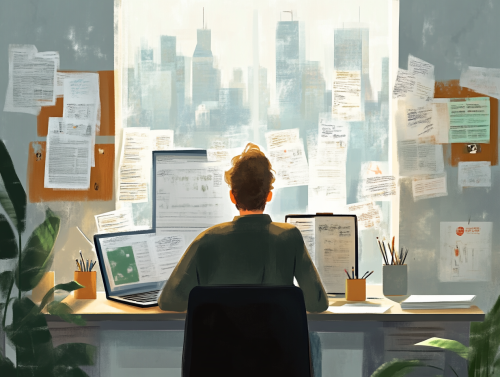 Create a series of 3-5 images featuring a character on a journey of work overload to effortless success, thanks to an AI assistant. The character, a young professional (gender-neutral or unisex), starts in a cluttered, chaotic workspace with humorous details (flying papers, endless to-do lists, exaggerated coffee cups). In each progressive image, the character’s workspace becomes more organized as the AI assistant (a cute, funny robot) takes on tasks. The character’s expressions evolve from frustration and overwhelm to excitement and joy, culminating in a final image where the character is calmly sipping coffee while the AI robot juggles tasks with humorous efficiency (e.g., creating content, analyzing data, sending emails). Bright, energetic colors and exaggerated facial expressions should create a dopamine-inducing sense of satisfaction, while funny visual elements (like the robot balancing too many tasks or calendar dates like ‘Due Yesterday’) bring a comedic tone.