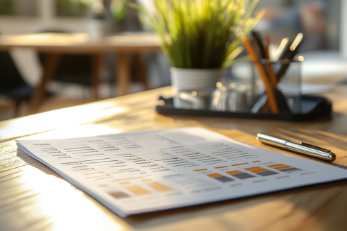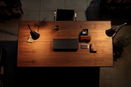 top down photograph depicting an elegant modern timber deskin the style of Peter Zumthor. the rich expensive grain of wood is evident with many blank A1 sheets of white paper sprawlled out all over, cinematic lighting, anti-aliasing, 8K --ar 3:2