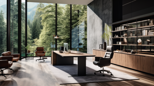 Photograph of a management office, with wood and concrete finishes, the floor is gray marble. The image shows a large minimalist and elegant wooden desk with Herman Miller chairs, in the space there is a sophisticated living room and a large window where natural light enters. Above the desk there is a black designer lamp --ar 16:9 --v 5.2