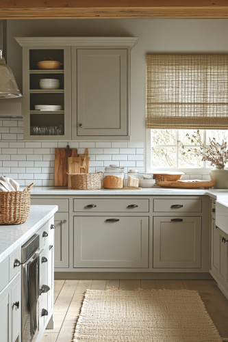 Show a serene kitchen with Pebble Peace gray kitchen cabinets in a warm, pebble gray tone. These cabinets should be paired with creamy limestone countertops and a soft, sand-colored tile backsplash for a harmonious, natural look. Include woven basket storage and linen window treatments to add texture and warmth. The floor should be pale bamboo, contributing to the peaceful, earthy vibe. This kitchen should be a calm oasis, perfect for relaxing and enjoying quiet moments. Neat and organized. Camera: DSLR - Canon EOS 5D Mark IV. Lens: Canon EF 24-70mm f/2.8L II USM. Composition: Wide shot, room-centered, horizontal orientation, balance between furniture and space. Film: Digital, high resolution, color profile sRGB. Camera settings: ISO 400, f/2.8, 1/60 sec. --ar 2:3 --v 6.1 --s 250