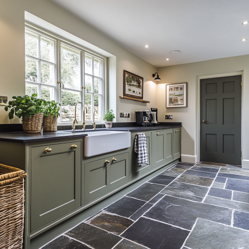 interior design photo of a kitchen with sage green cabinets, a dark quarts worktop and dark stone floor tiles. Cupboard handles and other fittngs are vintage brass.