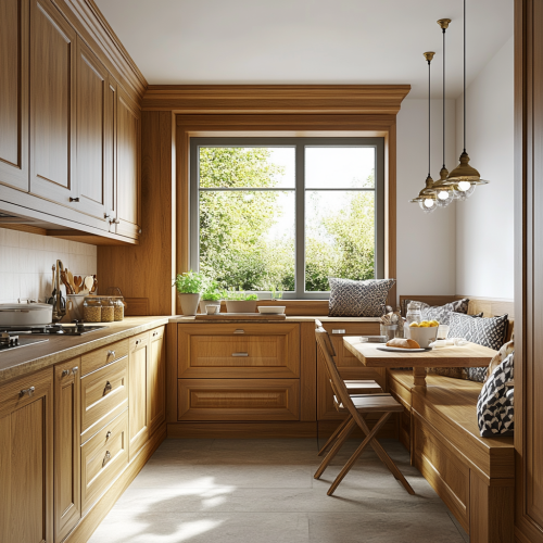 Classic American kitchen with wooden cabinets and a small breakfast nook, natural light coming in through a nearby window, a homey and inviting atmosphere, background blurred slightly for a cozy touch.