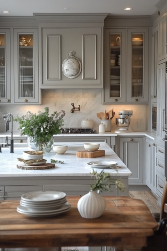 Illustrate a kitchen that holds a secretive, ghostly charm with muted gray cabinets, a backsplash of aged mirrors, and ethereal white marble countertops. Subdued, flickering light fixtures and sheer, flowing window treatments enhance the spectral mood. An antique table, possibly with hidden drawers or compartments, serves as a mysterious centerpiece. The overall ambiance should be hauntingly beautiful, inviting yet slightly unnerving. This kitchen should lure viewers with its ghostly elegance and mystery. Neat and organized. Camera: DSLR - Canon EOS 5D Mark IV. Lens: Canon EF 24-70mm f/2.8L II USM. Composition: Wide shot, room-centered, horizontal orientation, balance between furniture and space. Film: Digital, high resolution, color profile sRGB. Camera settings: ISO 400, f/2.8, 1/60 sec. --ar 2:3 --v 6.1 --s 250