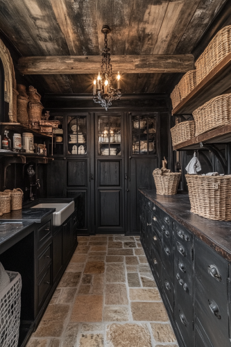 Present a Western Gothic laundry room featuring black steel cabinets and heavy iron fixtures. The room should have a strong industrial feel, but softened by warm, low lighting from a gothic chandelier. Wooden shelving holds baskets and vintage laundry accessories, while the stone floors reflect the iron details perfectly. The full view captures the rugged, masculine charm of the space, neatly organized and free from clutter. Highlight the fine textures of steel and wood for a professional, DSLR-captured feel. Camera: DSLR - Canon EOS 5D Mark IV. Lens: Canon EF 24-70mm f/2.8L II USM. Composition: Wide shot, room-centered, horizontal orientation, balance between furniture and space. Film: Digital, high resolution, color profile sRGB. Camera settings: ISO 400, f/2.8, 1/60 sec. --ar 2:3 --v 6.1 --s 250