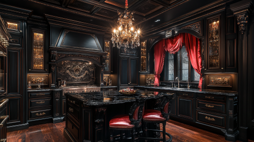 Craft an image of a kitchen that combines eerie elegance with functional beauty, featuring soft gray cabinetry, Victorian lace curtains, and an antique chandelier with flickering bulbs. The countertops could be of polished dark granite, and the floors a whitewashed wood, creating a ghostly contrast. Include a small herb garden growing in aged planters on the windowsill, adding a touch of life and color. This kitchen should attract those who appreciate a space that is both hauntingly beautiful and elegantly appointed. Camera: DSLR - Canon EOS 5D Mark IV. Lens: Canon EF 24-70mm f/2.8L II USM. Composition: Wide shot, room-centered, horizontal orientation, balance between furniture and space. Film: Digital, high resolution, color profile sRGB. Camera settings: ISO 400, f/2.8, 1/60 sec. --ar 16:9 --v 6.1 --s 250