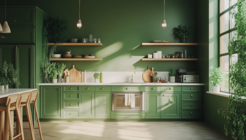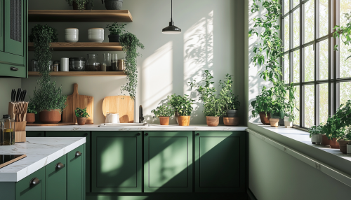 Lush green kitchen cabinets in a modern, sunlit kitchen, featuring sleek hardware, surrounded by natural wooden accents and white marble countertops, potted herbs on the windowsill, vibrant plants adding life, and a cozy atmosphere. --ar 128:73