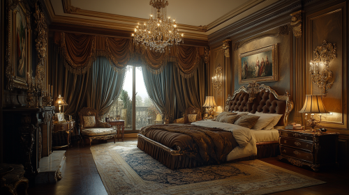 Visualize a regal bedroom with a tall, velvet-upholstered bed frame, ornate carvings on dark wood furniture, and heavy damask curtains that pool on the floor. A large, antique mirror reflects a crystal chandelier, casting sophisticated patterns of light across the room. Walls lined with classical oil paintings and a fireplace with a sculpted mantel enhance the aristocratic feel. This bedroom should exude an air of old-world charm and eerie elegance, appealing to those who love a touch of Gothic in their luxury. Camera: DSLR - Canon EOS 5D Mark IV. Lens: Canon EF 24-70mm f/2.8L II USM. Composition: Wide shot, room-centered, horizontal orientation, balance between furniture and space. Film: Digital, high resolution, color profile sRGB. Camera settings: ISO 400, f/2.8, 1/60 sec. --ar 16:9 --v 6.1 --s 250