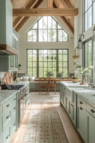 Create an image of a serene rustic modern kitchen with pale, soft green cabinets and natural wood accents that evoke a calm and relaxing atmosphere. The design should emphasize open spaces and minimal decoration to maintain a tranquil vibe. Large windows overlooking a garden or natural scenery should connect the indoor and outdoor environments. Soft, diffused lighting and simple, elegant furnishings should complement the peaceful color scheme. This photo should convey a sense of serenity and simplicity, attracting viewers looking for a tranquil kitchen space. Camera: DSLR - Canon EOS 5D Mark IV. Lens: Canon EF 24-70mm f/2.8L II USM. Composition: Wide shot, room-centered, horizontal orientation, balance between furniture and space. Film: Digital, high resolution, color profile sRGB. Camera settings: ISO 400, f/2.8, 1/60 sec. --ar 2:3 --v 6.1 --s 250