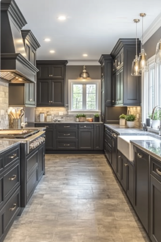 Show a kitchen with Coal Comfort dark kitchen cabinets in a charcoal finish, offering a soft yet powerful presence. These cabinets should be complemented by a glossy gray quartz countertop and a backsplash of slate tiles. Matte black fixtures and minimalist Scandinavian furniture should keep the space modern and functional. Soft woolen throws and cushions on a window seat can add a layer of comfort. This kitchen should be a stylish and cozy space, perfect for modern families. Neat and organized. Camera: DSLR - Canon EOS 5D Mark IV. Lens: Canon EF 24-70mm f/2.8L II USM. Composition: Wide shot, room-centered, horizontal orientation, balance between furniture and space. Film: Digital, high resolution, color profile sRGB. Camera settings: ISO 400, f/2.8, 1/60 sec. --ar 2:3 --v 6.1 --s 250