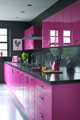 Create an image of a vibrant kitchen with Rose Radiance pink kitchen cabinets, offering a bold and bright focal point. These cabinets should be paired with modern black countertops and a high-gloss white backsplash to create a striking contrast. Opt for polished concrete flooring to add an industrial touch without the coldness of metal. Include chrome fixtures and a series of modern art pieces to enhance the energetic atmosphere. This kitchen should look lively and inviting, perfect for entertaining and lively home cooking. Neat and organized. Camera: DSLR - Canon EOS 5D Mark IV. Lens: Canon EF 24-70mm f/2.8L II USM. Composition: Wide shot, room-centered, horizontal orientation, balance between furniture and space. Film: Digital, high resolution, color profile sRGB. Camera settings: ISO 400, f/2.8, 1/60 sec. --ar 2:3 --v 6.1 --s 250