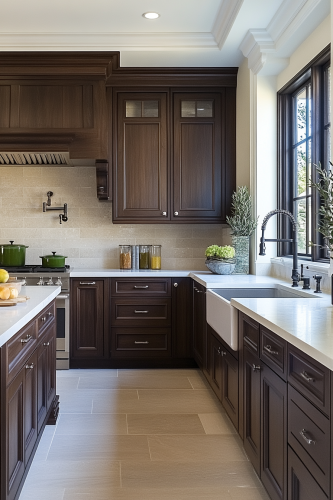 Create an image of a kitchen featuring Dark Walnut Wonder dark kitchen cabinets, showcasing the rich, deep hues of walnut wood. Pair these cabinets with a lighter sandstone countertop and creamy travertine tiles for the backsplash to soften the intense dark wood. An antique bronze pot filler and green ceramic accents can add a touch of color. The flooring should be reclaimed wood, adding to the rustic, yet refined feel of the kitchen. This kitchen should be warm and welcoming, combining traditional craftsmanship with luxurious materials. Camera: DSLR - Canon EOS 5D Mark IV. Lens: Canon EF 24-70mm f/2.8L II USM. Composition: Wide shot, room-centered, horizontal orientation, balance between furniture and space. Film: Digital, high resolution, color profile sRGB. Camera settings: ISO 400, f/2.8, 1/60 sec. --ar 2:3 --v 6.1 --s 250