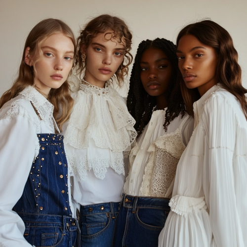 4 models wearing studded indigo denim in style of ulla johnson with white chiffon shirts top button unbuttoned in the style of chloe on a neutral background for fall season
