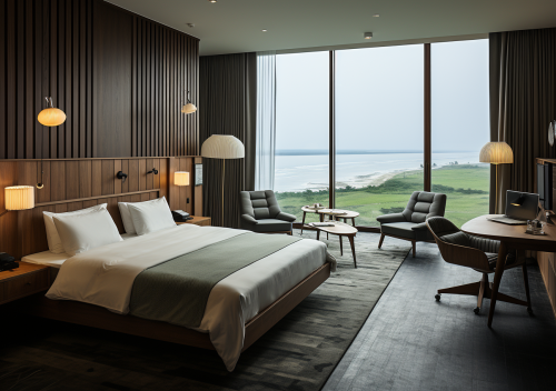 Design a clear and modern icon for office employees, indicating that they must pick up their guests from the reception. The icon should feature a simple outline of two figures: one representing an employee and the other a guest with a visible badge. Include a small reception desk or door symbol, with an arrow showing the employee guiding the guest. Use professional colours like blue, grey, and white, and ensure the design is clean and easily understandable at a glance.