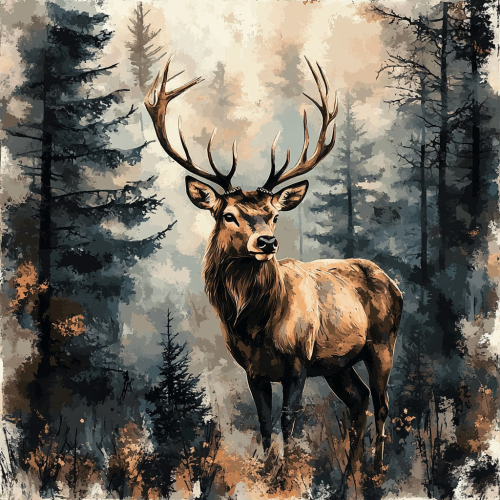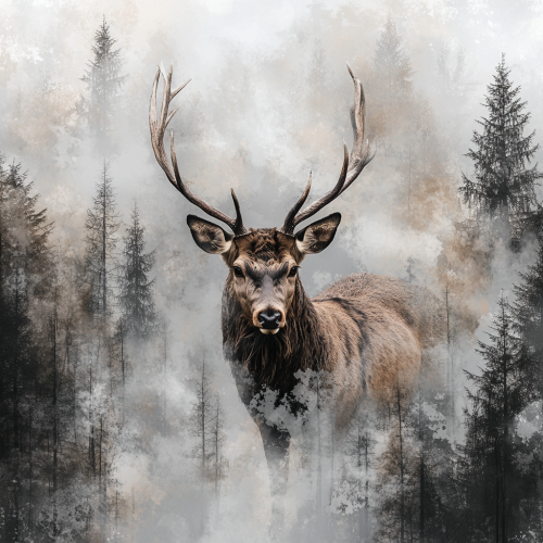 9:16 artistic style image with splashes and brush strokes background cloudy forest middle ground beautiful painted deer with antlers in foreground it is blocked by view of cloudy coniferous forest
