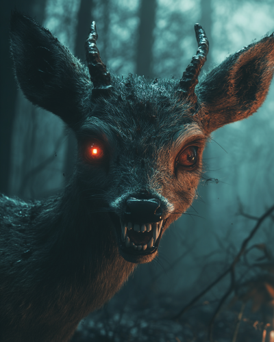 Bambi the reckoning, Animal Horror, scary forest Background, scary tall teeth deer, slasher Horror, insane Art, 4K, dramatic Lights, dramatic Horror, hyperrealistic, high quality, high details --ar 4:5 --s 250 --v 6.1