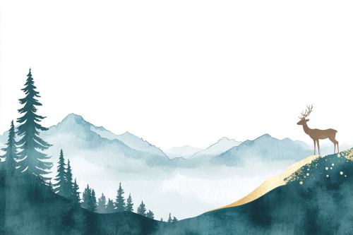 White background, blue, forest with tall trees on the left side of the page, mountains in the distance, a deer standing at the top of a hill, in a simple watercolor style, with white space around the other elements, and a teal blue and gold gradient color scheme. --ar 3:2 --v 6.1