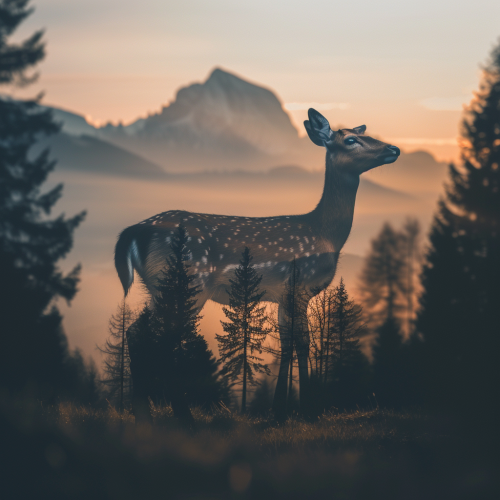 Fallow deer in double exposure of forest and landscape of the Dolomites, silhouette, ultra detailed, soft lights, splendid color gradation, Unreal Engine, Cinematic, Color Grading, Photo shoot, Shot with 85 mm lens, f1.2, Depth of field, DOF, 32k, Super-Resolution, Megapixel, Backlight, Natural Lighting, Soft Lighting, Conte-Jour, Stunning Lighting, Global Illumination, Hypermaximalist, Elegant and Dynamic Pose, Photorealistic, 8K, Volumetric Lighting, High Contrast, HDR, --v 6.0