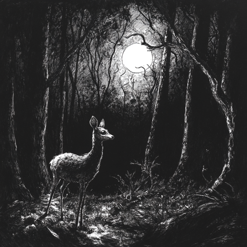 Illustrate a dark forest scene with a lone deer-like creature standing under the light of a full moon, inspired by Edward Gorey’s unique style. The creature should have a simple, slightly surreal design, with wide, expressionless eyes that convey a sense of mystery. Use meticulous cross-hatching to create texture in the trees, shadows, and the creature’s form, adding depth and an eerie atmosphere. The background should be minimalistic yet dense with shadows, with hints of small eyes or faint shapes peeking from the forest floor, creating a sense of quiet unease. Include symbolic elements, like twisted branches forming ominous shapes, to enhance the haunting, solitary mood.