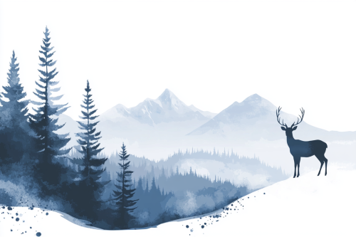 White background, blue, forest with tall trees on the left side of the page, mountains in the distance, a deer standing at the top of a hill, in a simple watercolor style, with white space around the other elements, and a blue and gray gradient color scheme. --ar 3:2