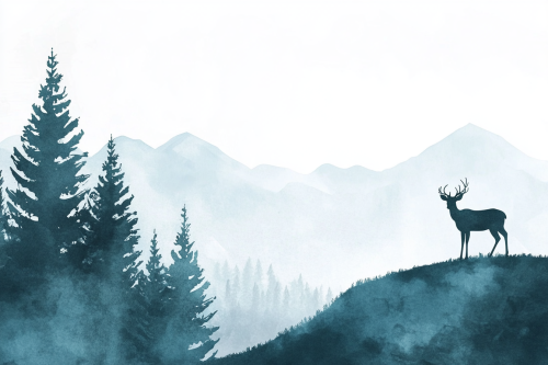 White background, blue, forest with tall trees on the left side of the page, mountains in the distance, a deer standing at the top of a hill, in a simple watercolor style, with white space around the other elements, and a teal blue and gray gradient color scheme. --ar 3:2