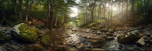 Wide shot photograph of an arboreal forest on a mountain with a stream and a deer. Hyper-realistic. --ar 3:1