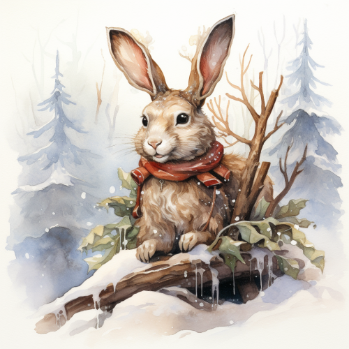bunny rabbit wearing a 'madbomber' hat rides atop a staghorn deer through a winter woods, snowing, watercolor