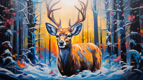 A deer in winter in forest, fairy tale illustration, graffiti, eye catching color, --ar 16:9 --v 5.2