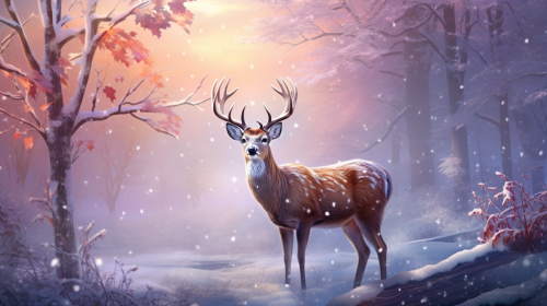 A deer in winter in forest, fairy tale illustration, mixed media, eye catching color, --ar 16:9 --v 5.2