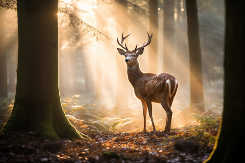 create a perfect photograph of a deer in the forest. It is foggy. Rays of sunlight penetrate through the deciduous trees. --ar 3:2
