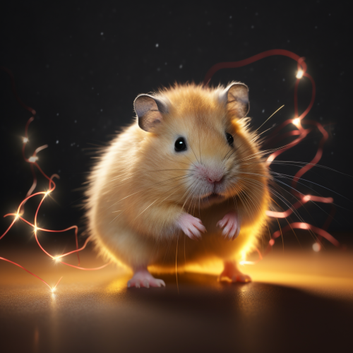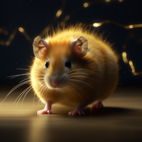 A fluffy yellow hamster emitting electricity, with an unusually large tail that has black stripes::1.4 , The hamster is small but exudes energy, with sparks flying around its tail. The scene captures the unique and cute, yet powerful nature of the creature --v 5.0