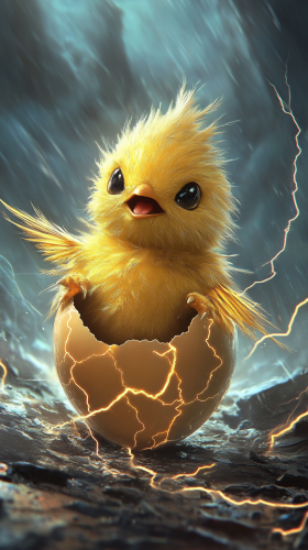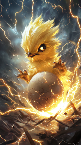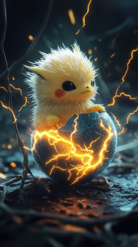 Chibi-style baby Joltik hatching from a small, electric-charged egg. The egg has tiny lightning patterns on it, and Joltik looks adorable with its fuzzy body and tiny legs, surrounded by sparks of electricity. The background is a dark, stormy sky with bright flashes of lightning. 8K, HDR, high quality, --ar 9:16