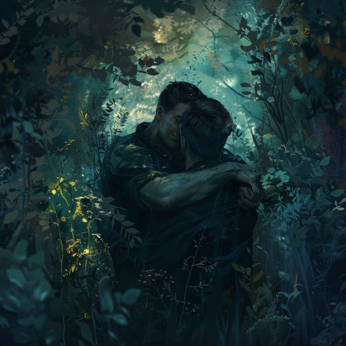 dark romance setting with man embracing another man from behind countryside overgrown, wild