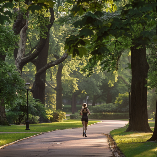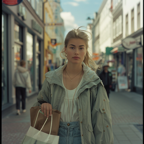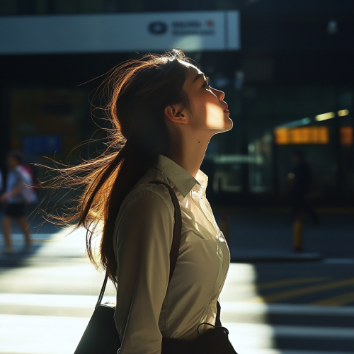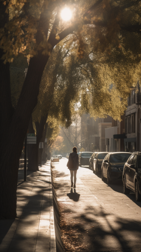 A candid photo of a person walking down a quiet street during the day, with soft sunlight creating natural shadows. The person is wearing casual clothes, and the pavement and nearby buildings have detailed textures. The background includes parked cars and a few trees. The image should feel like a normal everyday moment, with subtle lighting and natural details like small cracks in the pavement or slight imperfections on walls --v 5.0 --ar 9:16