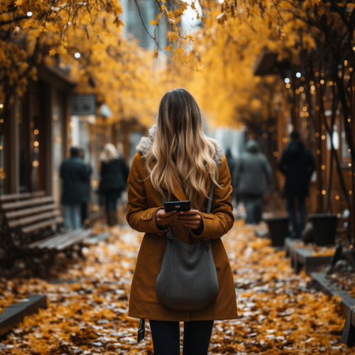 a tree lined street with beautiful fall trees and colored leaves on the ground while a black woman walks with a cell phone in hand and a coffee in the other hand --s 750 --v 5.2