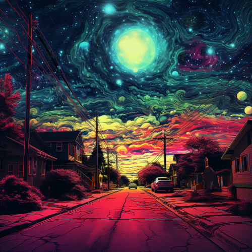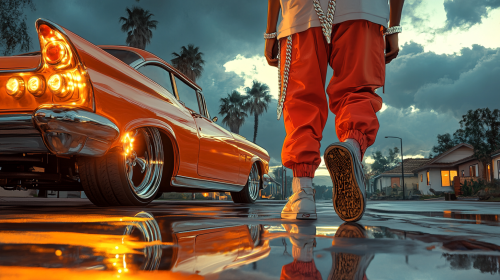 A 1950s pizza delivery boy dressed like a modern rapper, wearing baggy pants, oversized chains, and sneakers. He’s walking away from a tricked-out 1950s car with flashy rims, neon lights, and bold modifications. The suburban street has retro houses in the background, blending classic and modern street style, glibatree prompt, vibrant colors, humorous fusion, dynamic lighting --ar 16:9 --v 6.1 --s 250