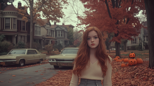 A young Sissy Specek in 1976 with long wavy red hair and big blue almond eyes in school clothing is walking down a residential street with her arms flded looking sad and scared and forlorn, lots of large twisted trees and fall atmosphere, red leaves, twisted tree branches and piles of leaves everywhere, old creepy Victorian houses, 1970s era cars, soft filter, diffusion filter, haunting and creepy, Jack-O-Lanterns in windows, photorealistic --ar 16:9 --v 6.1 --style raw