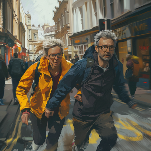 blonde middle-aged woman and dark-haired middle aged man with glasses running down a street in UK. Photo realistic.