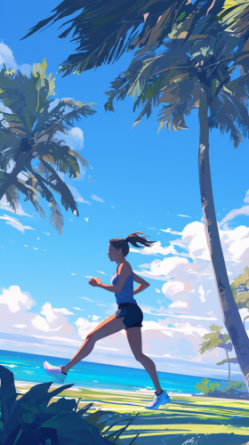 Korean woman jogging, Hawaiian background, pretty scenery, 4k, simple --ar 9:16 --niji 6