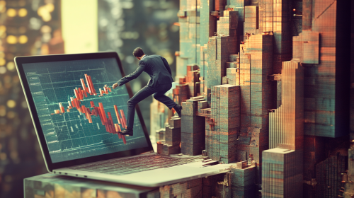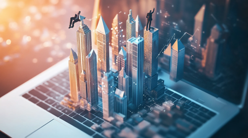 a photo realistic scene of an open laptop showing a marketing chart. The laptop is open in the foreground and 3D city buildings are shooting out from its screen. The buildings are made of marle stone and the architecture is arrow-like. The arrow shaped buildings represent market share in a 3D graph. A mountaineer dressed in a business suit is climbing up the side one of the buildings using a thich braided climbing rope. --ar 16:9