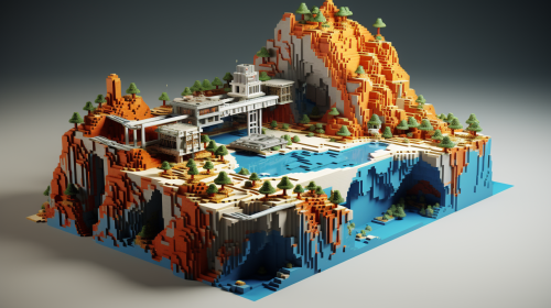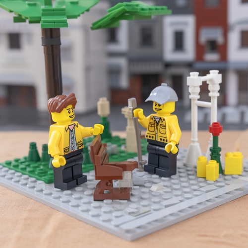 a 2.5d LEGO brick scene with an engineer building blocks in the scene and an engineer interacting with a resident in the scene and an engineer taking notes outside the scene, LEGO art style --v 5.0