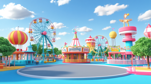 A vibrant amusement park environment featuring cute 3D cartoon style, with a total of no more than 6 simple tall buildings and props. The overall structure is clean, simple, and tidy, with all elements located in the top two-thirds of the image. The lower third is composed of a smooth circular ground, with a clear and straight separation from the background. Use a low angle close-up lens to capture the scene, avoid wide-angle or panoramic shooting, and ensure that there is no lens blur. The composition emphasizes spatial depth and strong perspective, maintaining a playful and relaxed atmosphere through meticulous minimalist design. --ar 16:9 --v 6.1
