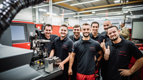 A candid team picture of a small team of cnc-engineers in a hall. The engineers are in the foreground in the right part of the picture, while the rest of the picture shows the working enviroment with cnc-machines. The picture conveys team building and teamwork of cnc-engineers by making the engineers stand out. The picture conveys the wish to be a part of this team and start working with them. Blue light and blue photo filter, photorealistic, blueish vibe HDR --ar 16:9