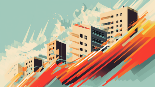 vector type graphic showing a simple highrise building shaking in an earthquake. This should represent structural dynamics. --ar 16:9