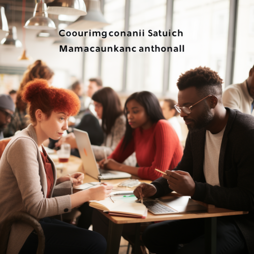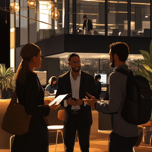 Generate a digital art for A digital art scene depicting a modern workplace where colleagues are engaged in a collaborative discussion. The atmosphere is warm and inviting, with people showing understanding and empathy towards each other. The background features a sleek, contemporary office design with subtle use of black color to highlight the importance of empathy in fostering a positive work environment. The overall mood is one of cooperation and mutual respect. Colors to be used: Black, subtle shades of grey, and warm tones. --ar 1:1