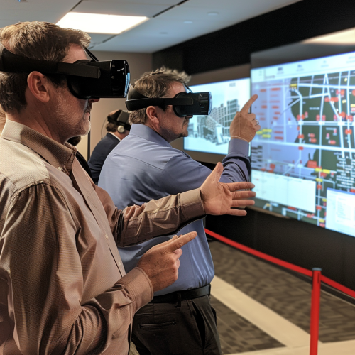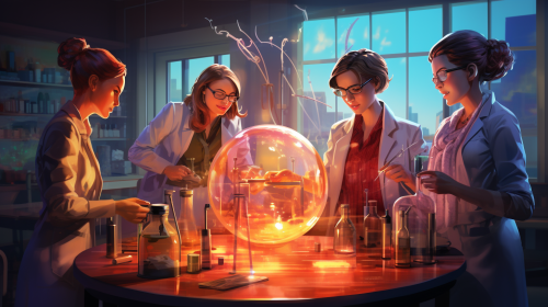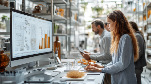 Team of Engineers and Scientists Working Together: A diverse team of professionals (engineers, scientists, architects) in a lab or workshop environment, discussing and analyzing materials. Include elements like computer screens showing CAD designs, samples of hemp fibers, and models of buildings, to illustrate collaborative innovation --ar 16:9 --stylize 1000
