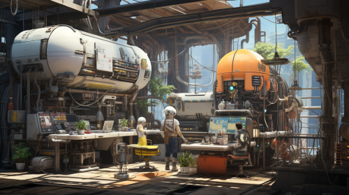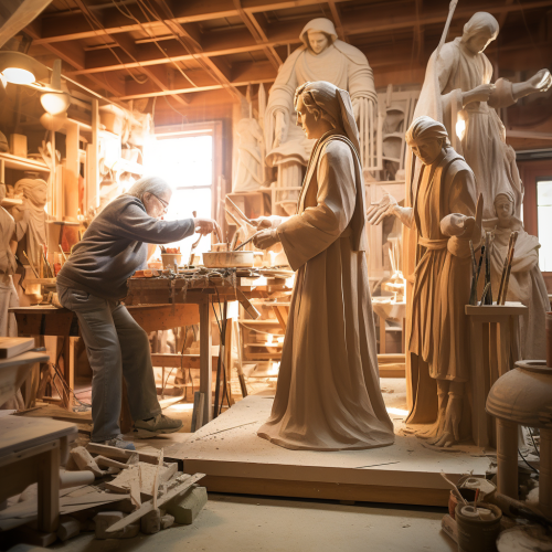 Clay model together with sculptor, workshop high ceiling, lots of natural light, a woodcarver and a robed nurse are trying to weld a metal assembly