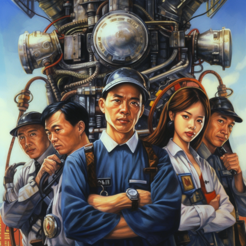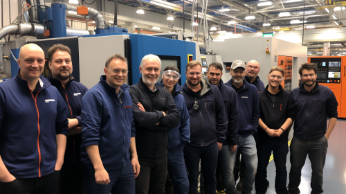 A candid team picture of a small, diverse team of cnc-engineers in a hall. The engineers are in the foreground in the right part of the picture, while the rest of the picture shows the working enviroment with cnc-machines and sophisticated carbon parts. The picture conveys team building and teamwork of cnc-engineers by making the engineers stand out. The picture conveys the wish to be a part of this team and start working with them. Blue light and blue photo filter, photorealistic, blueish vibe, HDR --ar 16:9