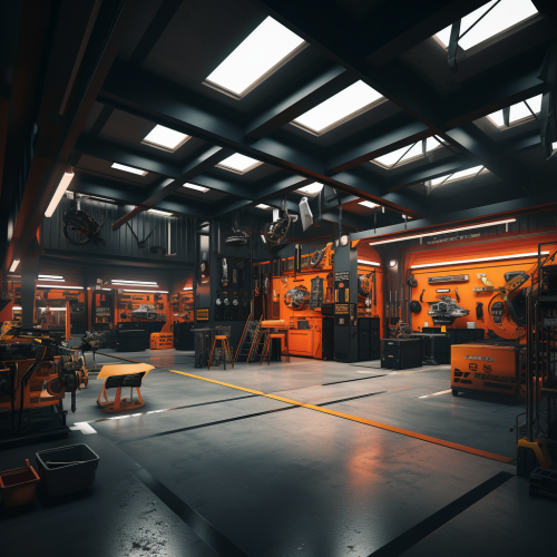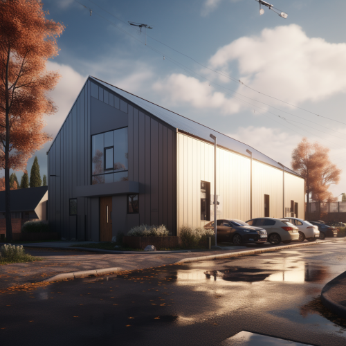 Modern electro workshop building in Scandinavia with a small parking lot in front of it, daytime, realistic image
