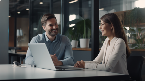 An engineer and a client sit at a table with a laptop and give him advice in a bright office. They smile. Photorealistic image. HD. Bright --ar 16:9